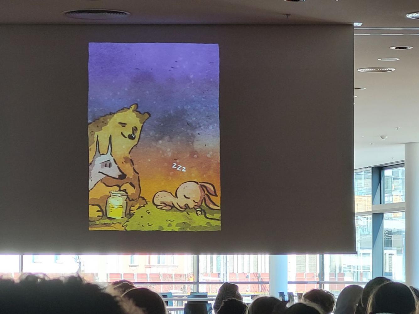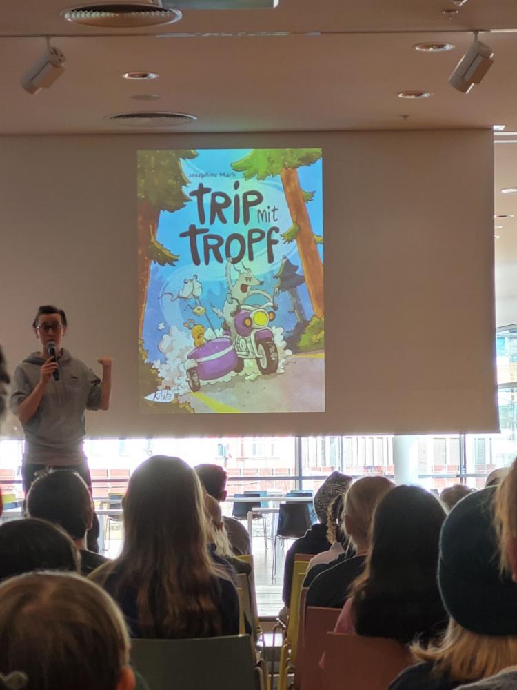 Die Autorin und Illustratorin Josephine Mark stellte in der Stadtbibliothek ihr Comic "Trip mit Tropf" vor. Filmreif inszeniert und stimmungsvoll vorgetragen, erlebten die SchülerInnen die bewegende Geschichte zweier sehr ungleicher Weggefährten.